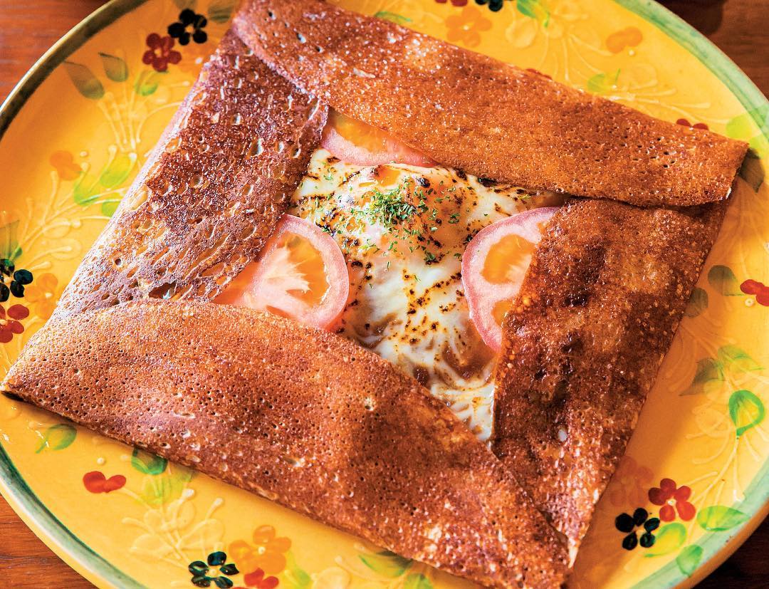 写真は、名物のオリジナル焼きカレーのガレット(1580円)。トマトで酸味を加えて、さわやかな口当たりに仕上がりに。