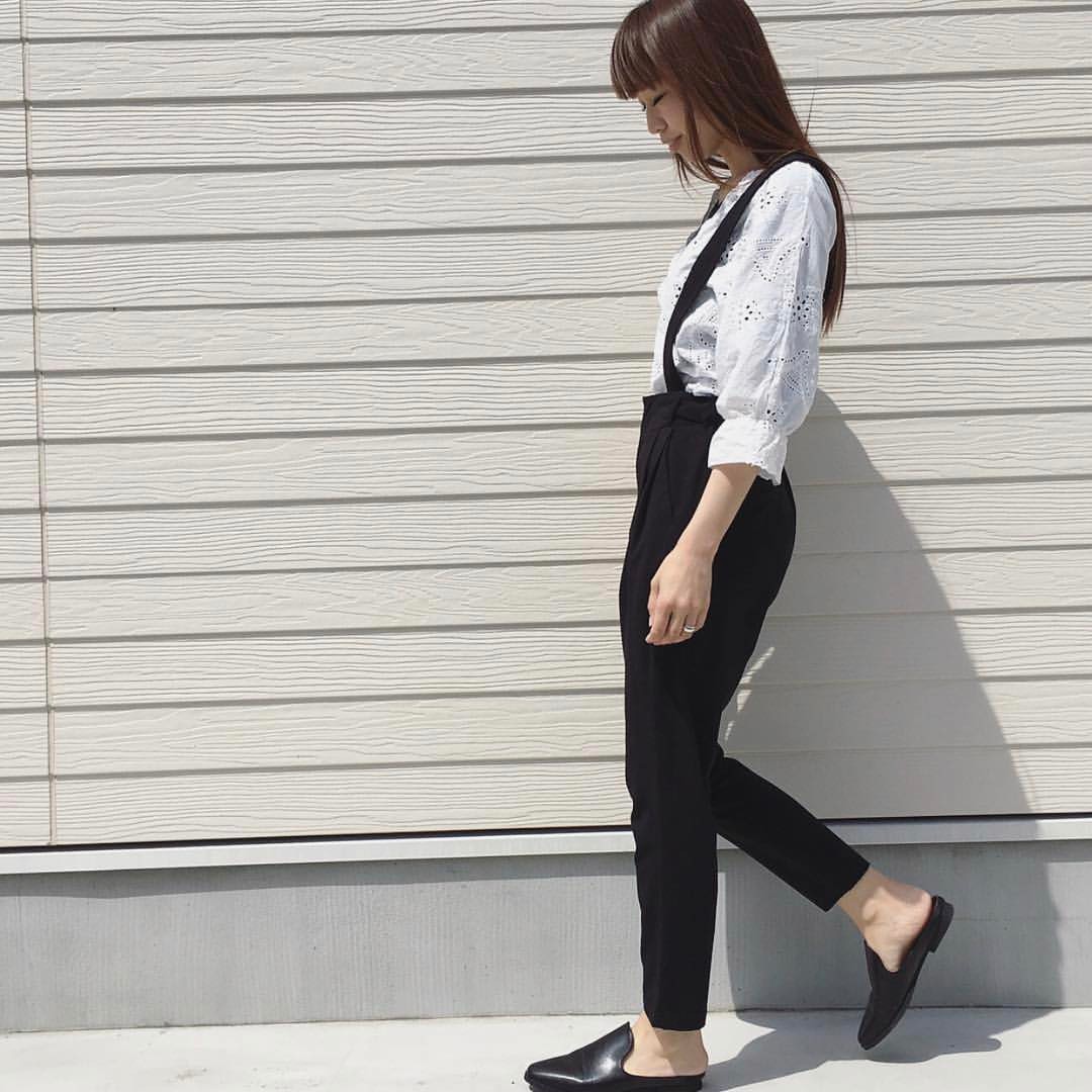 ✔︎ 白のチュニックに黒のサロペットを合わせたスタイル♡