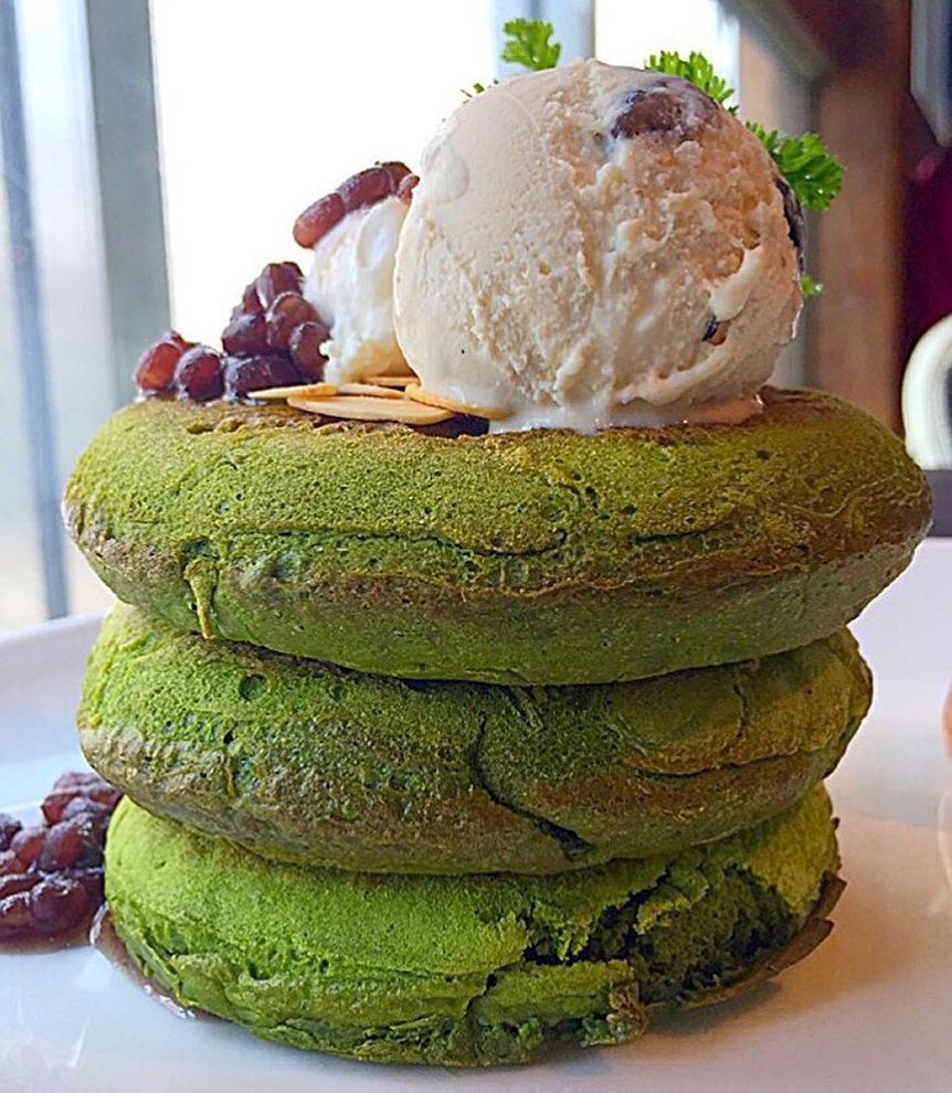 こちらは渋谷にある「MICROCOSMOS」さんの「抹茶とわらび餅のパンケーキ」です。抹茶の生地にわらび餅を混ぜて焼き上げた風味と食感のバランスがいいパンケーキです。生地はもちもちしていて小豆との相性は抜群です。ボリューム満点の一品です。