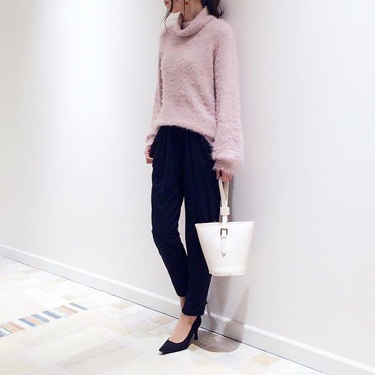 ✔︎ ピンク✖️ブラックの女性らしいカラーを取り入れたコーディネート♡ タートルニットを着るときは髪をアップにするのがオススメ!すっきりとした印象になります♡