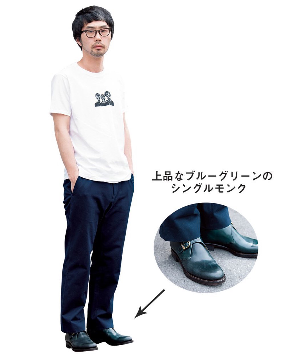 「無地Tやその延長で着られるシンプルなロゴTが好きで、夏はよく着ています。ただ、それだけではひねりがない。たとえば今日のペトロールズのバンドTには、最高級のコードバンを使用した堅牢な佇まいのシングルモンクの革靴を合わせることで、少し違和感を狙ってみました。このくらい硬軟を取り混ぜるぐらいがちょうどいいんです」(手嶋 慎さん/メイカーズ デザイナー)
