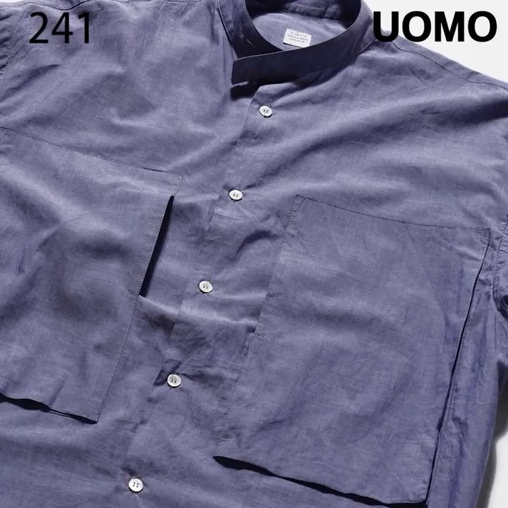 「業界随一(たぶん)の肩幅を誇る僕でも肩が落ち(かなり貴重)、ブルーシャンブレーにボックスシルエット、バンドカラー…と今の要素も満載。ポケット好きとしてはこのアイコニックなビッグポケットも見逃せない」(UOMO編集 吉﨑)⠀