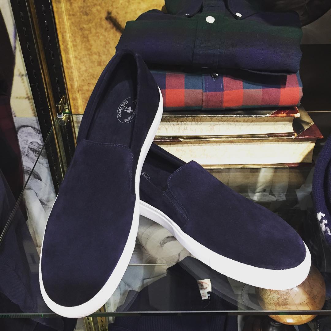 ブルックス ブラザーズ2016秋冬展示会で見つけたレッド フリースのスリッポン。ネイビー×白の大人っぽいスリッポン、いい!