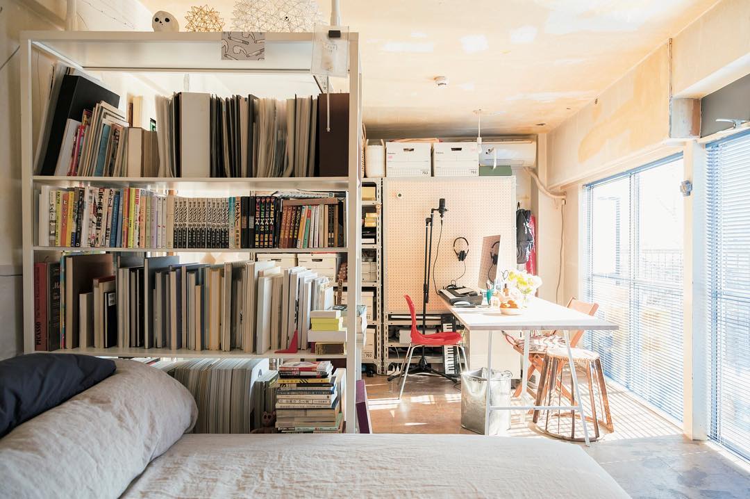 コンパクトな部屋だからこそ、レイアウトを考えるのが楽しい。プロダクトデザイナーの藤田哲平さんは、玄関の近くにベッドを置くなどレイアウトの定石を無視した部屋で生活。「無意識のうちにとらわれている常識を取り払うと、逆に心地のいい空間になることも」と藤田さん。