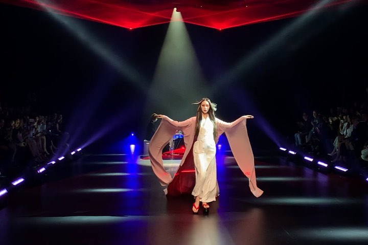 東コレ取材:「ヨシキモノ」のショー終盤にはYOSHIKIご本人が登場し、ピアノを生演奏✨ 袖丈の長い着物を着たダンサーが妖艶な動きでランウエイを歩き、観客を魅了しました。