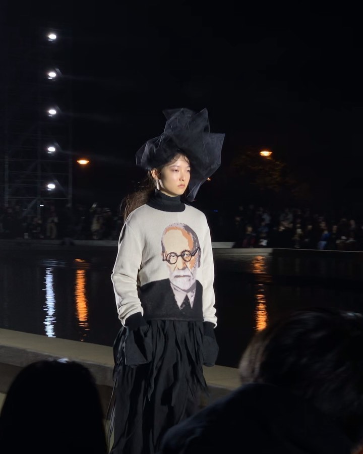 イベント取材:「リトゥンアフターワーズ」のショーでは、クリエイションの境地を感じさせるルックが数多く登場。しかしその中で突然ある偉人の顔が縫い込まれたニットが登場し、ブランドらしいウィットに思わずニヤリ。さて、これは誰でしょう?