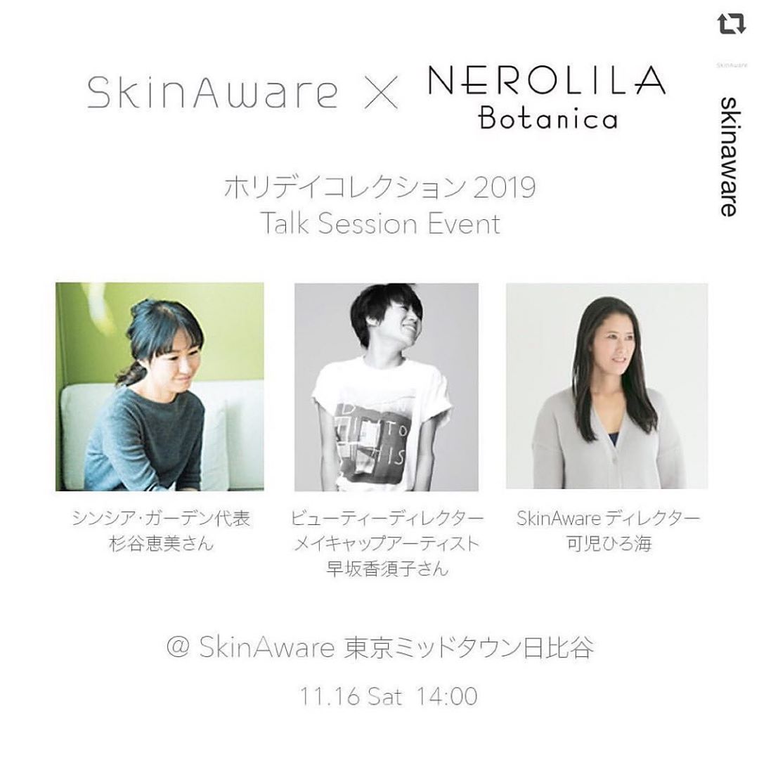 I’m attending a talk event at SkinAware boutique in Hibiya Midtown on this Saturday. Stop by at our shop!