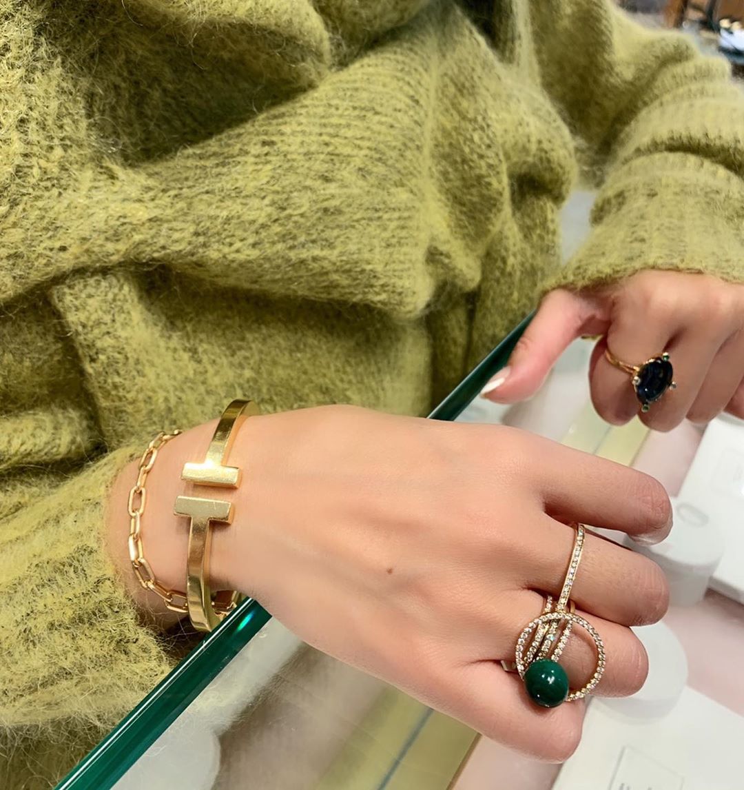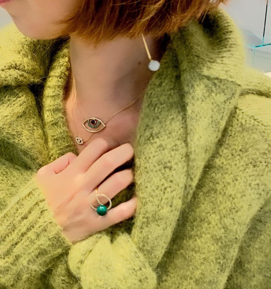 イエローのざっくりニットに、スーリヤアイの重ね付け、そしてお気に入りのマラカイトのオーブリングを付けて…