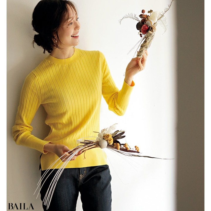 実家に帰省するなら、チアフルカラーニット×デニムのカジュアルスタイルで。黄色なら1+1コーデでもおしゃれ見えに。リブニットの縦感が、上半身をスッキリ見せてくれるのもうれしい♪