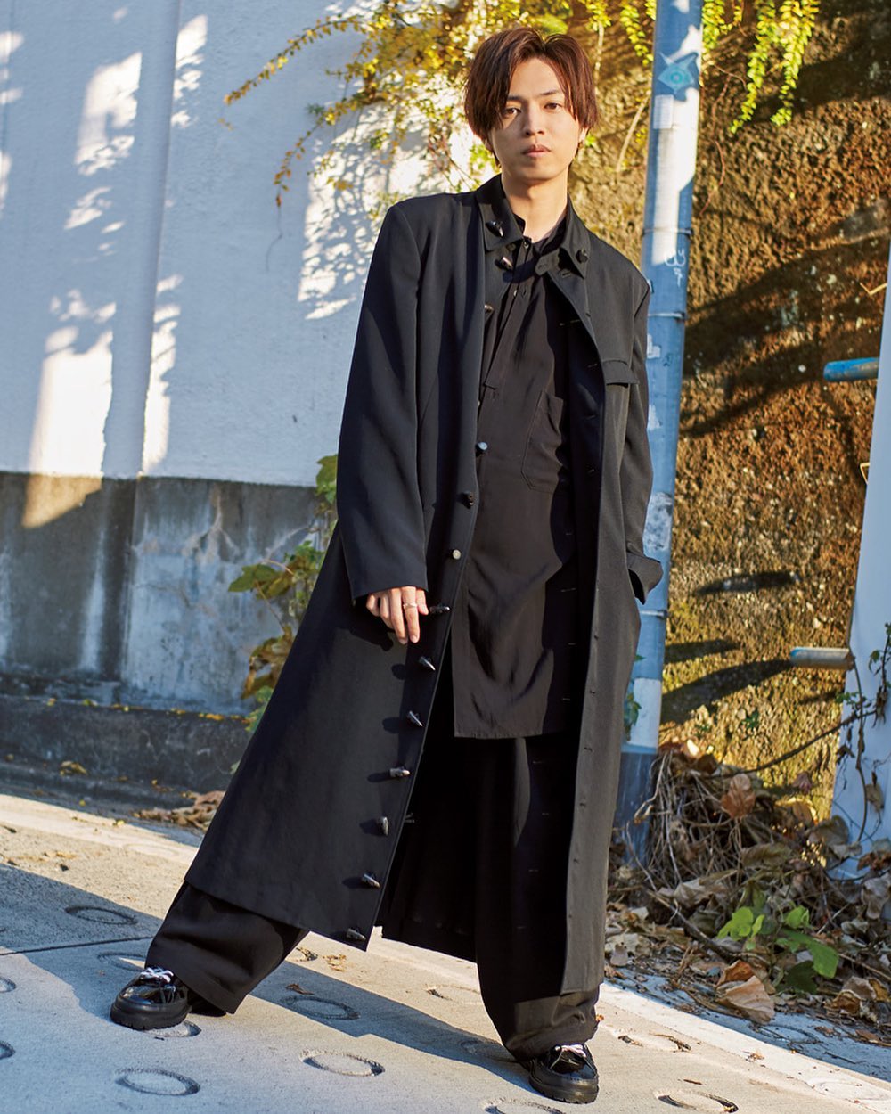 「ファッションの入り口が古着だったこともあって、こういうモードなロングジャケットもトグルボタンなどカジュアルな遊びがきいたものが好きですね」と、全身黒のエレガントなコーディネートを軽快かつ自然体でこなす桐山さん。ビッグシルエットも今の気分だそう。「役者の仕事をしているときはかなり集中しているので、それ以外の時間はなるべくリラックスしていたいなあと。ただ、ユルい中でも清潔感は心がけています。それと普段の服装で大事にしているのは無理をしないこと。僕は強めのデザインも好きですし、この先40代になっても基本は好きな服を着ていたいのですが、自分に無理なく馴染むテイストというのはきちんと把握しておきたいですね」