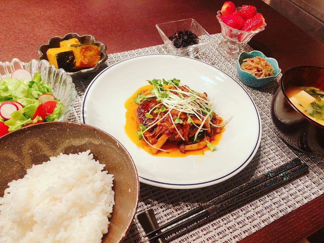 #いつの日かのごはん #デミグラスハンバーグ #ひじきの煮物 #かぼちゃの甘煮 #きんぴらごぼう #サラダ #お味噌汁 #ごはん #いちご #丸高ごはん
