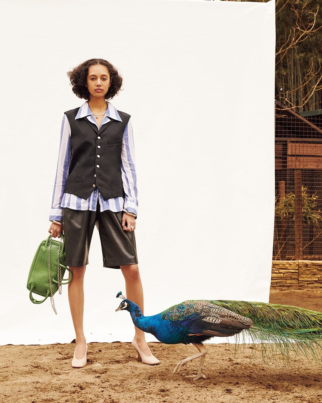 今季気になるマスキュリンなスーツベストに、気張らないナチュラルなシャツとレザーのバミューダパンツ。脚を出して肌感のバランスをとれば、レディライクなムードに。どこを持てばいいか迷ってしまう、ひと癖あるユニークバッグをハズしに添えて。