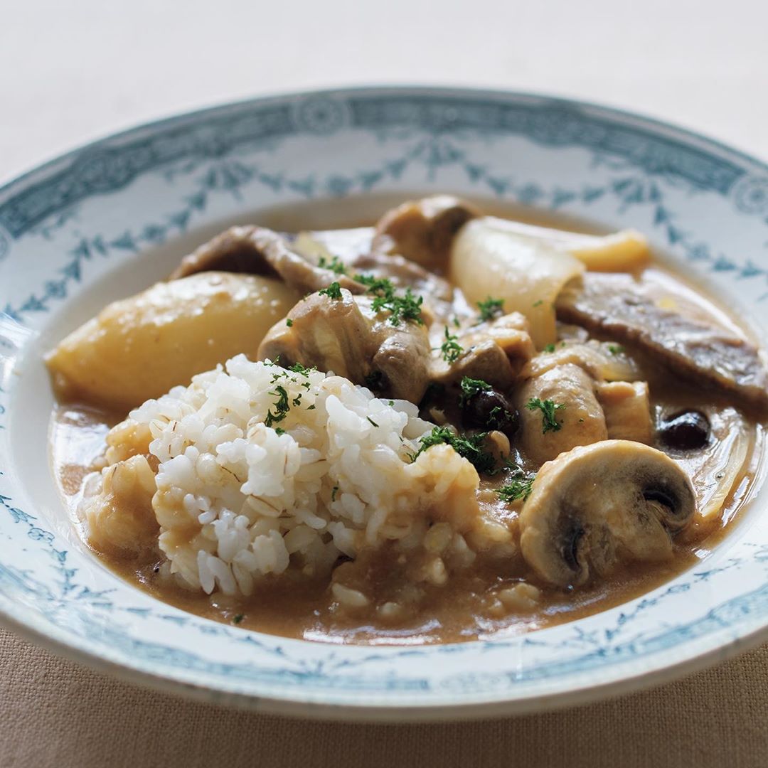 醤油麹大さじ1 酒粕大さじ2強 信州味噌大さじ1と1/2 焼肉用牛肉120g マッシュルーム5個 蒸し大豆50g 玉ねぎ小1個 みりん大さじ2 コンソメ(顆粒)小さじ1 バター大さじ2 もち麦ご飯適量 パセリ適量
