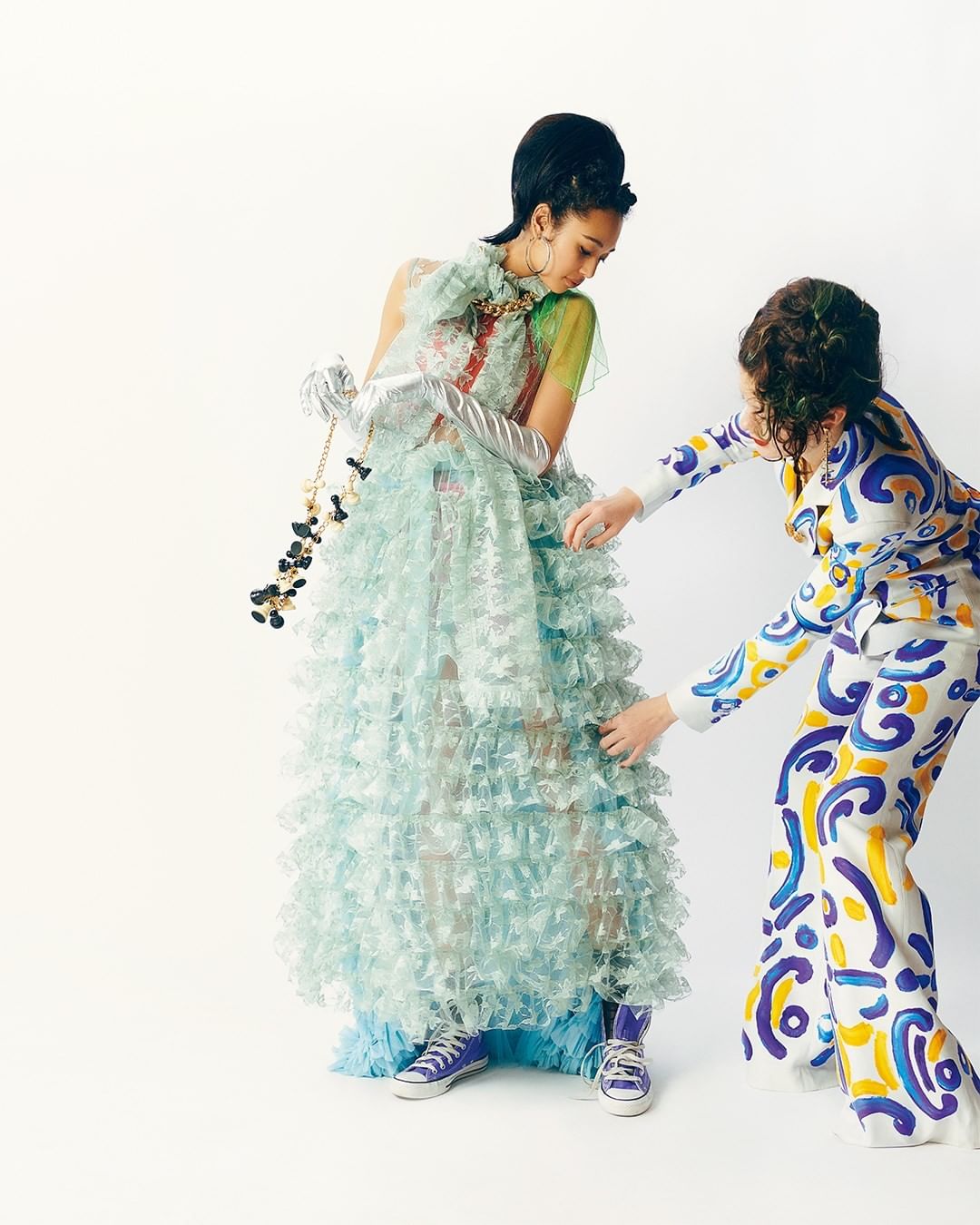 私はもっとガーリーに、レースを好きなだけ着て華やかなドレスアップ派。ロマンティックたっぷりな首もとのBIGリボンやレースのラッフルに、ロンググローヴを着けてとにかくプリンセス風に仕立てて。足もとはコンバースのスニーカーでハズして、私らしい着こなしの演出も忘れない。