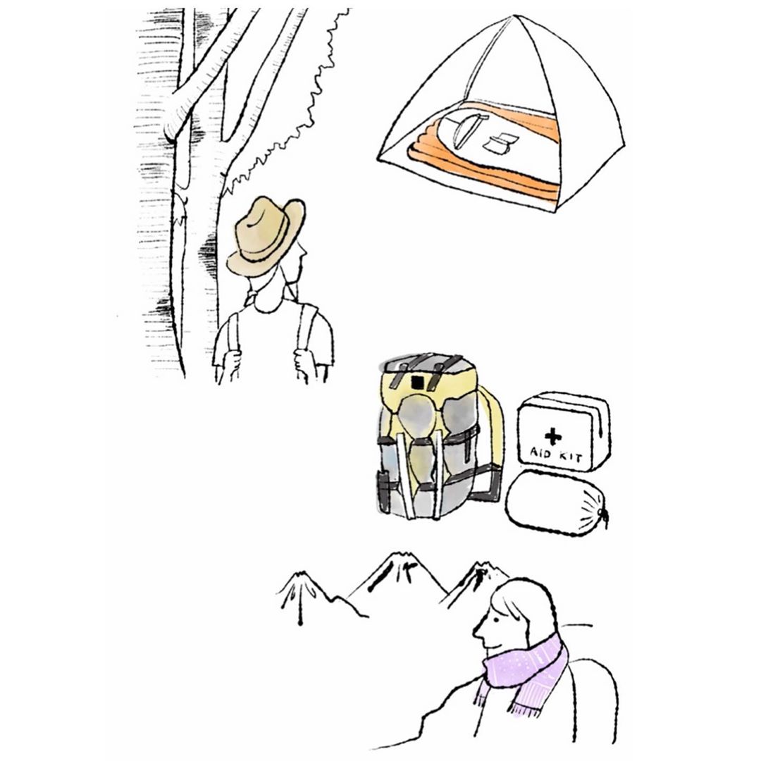 モデル仲川希良さんは麦わら帽子、アウトドアライター山畑理絵さんはグラナイトギアのバックパック、山岳ジャーナリスト柏澄子さんはストール、イラストレーター落合恵さんはエクスペドのマットについて。旅するおもしろさや情緒が、それぞれの物語から伝わってきますよ。