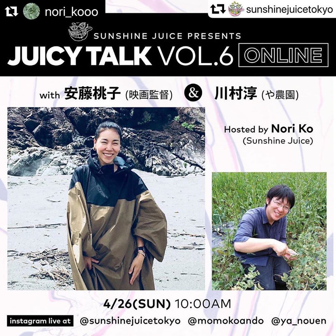 今週のサンデーモーニングも健康最先端トーク、”JUICY TALK” vol.6、インスタグラムライブにて開催します🌞今回のゲストは、映画監督で現在高知在住の安藤桃子 @momokoando さんと、高知県で有機栽培でエネルギーのある野菜を作っている”や農園”の川村淳さん @ya_nouen のダブルゲスト、ホストはSunshine Juice代表コウノリ @nori_kooo で朝10:00から!