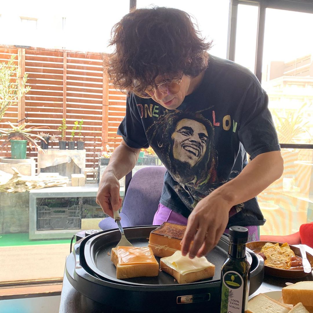滝藤賢一のバルコニーライフ。「シェフ 三ツ星フードトラック始めました」という映画の中に出てくるトーストがあまりにも美味しそうで…次の日早速真似してみました(笑)。普段あんまり料理はしないんだけど、ホットプレートなら簡単だしね。そんな様子を見るボブ・マーリーTシャツは散歩がてら立ち寄った原宿の古着屋で偶然見つけて買ったんですよ。こういうキャラクターTって若いころは着られなかったんだけど、逆に40歳過ぎてから着られるようになりました。スヌーピーのTシャツとかもよく着ますよ。言い方は悪いけど、ちょっとダサいTシャツを適当に着ているっていうのが僕の好きなスタイルのひとつ。ツーブリッジの黄色いレンズのサングラスはニードルズのもの。ファンキー父ちゃんみたいな感じでいいですよね(笑)。 #needles #used #bobmarley #ニードルズ #古着 #ボブ・マーリー