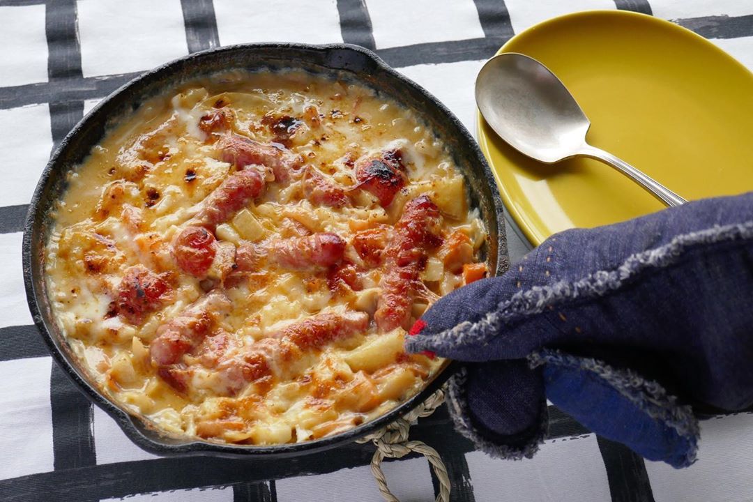 写真はダッチオーブンやスキレットなどの鋳鉄の鍋でつくるソーセージのイモイモグラタン。ホワイトソースを使わずに簡単にできるので、ぜひお試しください!