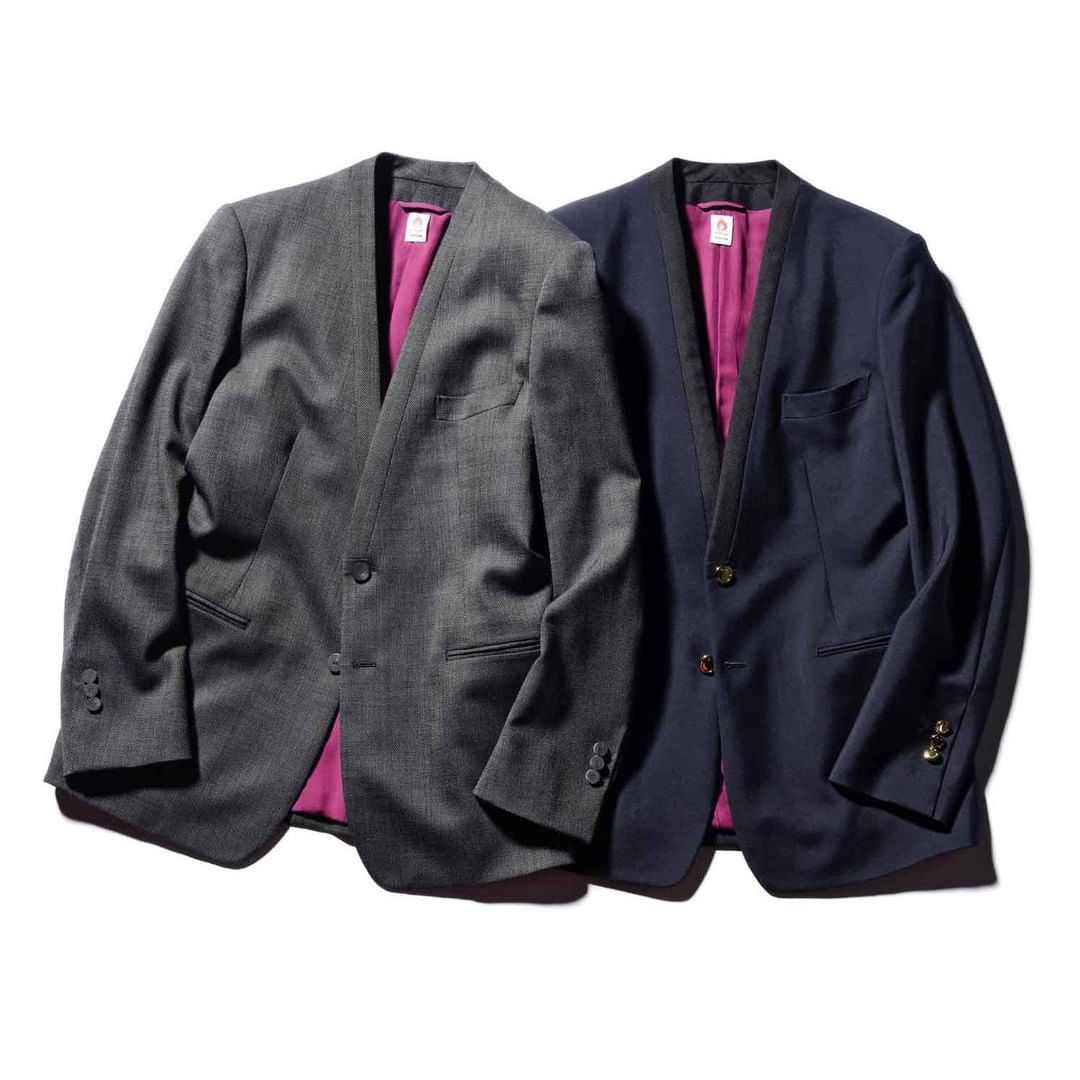 首回りから胸元のラペルが省かれたエムズ ブラック コスチュームのノーカラージャケットは、通常のジャケットに比べすっきりとした印象を与える。肩パッドを少し入れた構築的なシルエットや襟のパイピング、素材にウールを用いドレスライクで大人らしい表情に。その反面、裏地にはビビッドなパープルのカラーリングを採用し、相反するテンションが面白いジャケットだ。 「エムズ ブラック コスチュームのノーカラージャケット」左からジャケット¥78,000、ブレザー¥86,000(セコンド ショールーム〈#エムズブラック 〉)※税抜価格