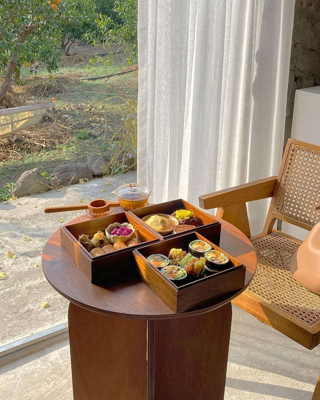 韓国・済州島にある「카페 차롱(カフェ チャロン)」では、お弁当のような木箱に入ったキンパやいなり寿司を頂くことができます。日差しが入り込む暖かい店内で韓国風お弁当を食べてみてください。