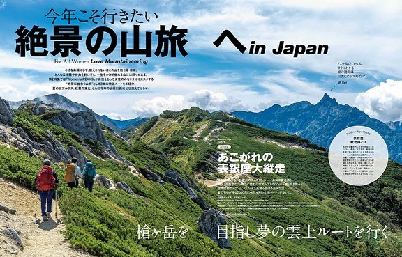 今シーズン大注目のウィメンズウエア&ギアをたっぷりご紹介しています! カタログだけではなく、女性ならではの山でのスキンケアやヘアメイクについてや、絶景に出合う山旅ルートも披露しています。