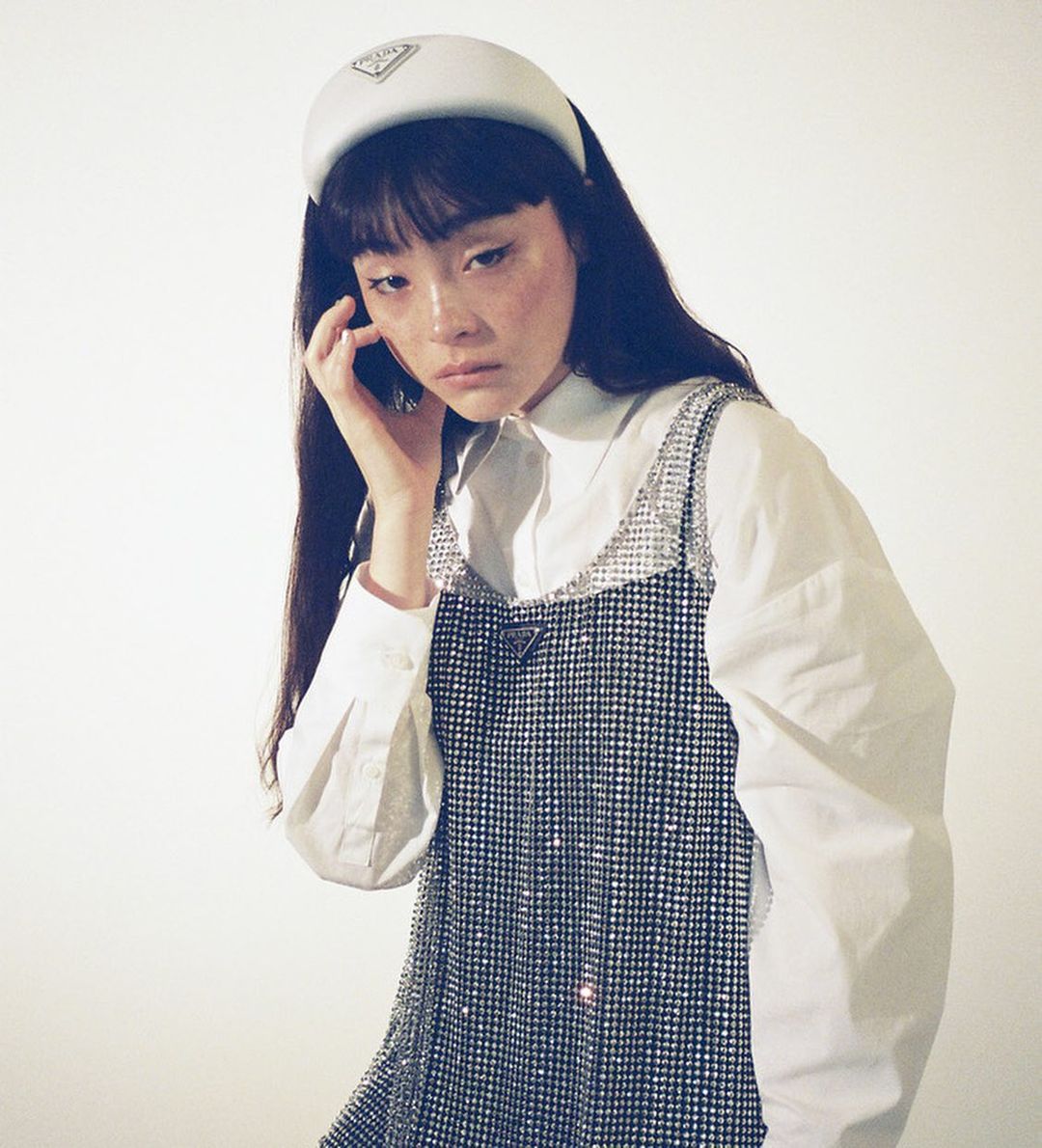 端正な顔立ちの衿周りとのギャップが可愛いシャツロンパースに、クリスタルを全面に施したゴージャスなミニドレスをミックス。