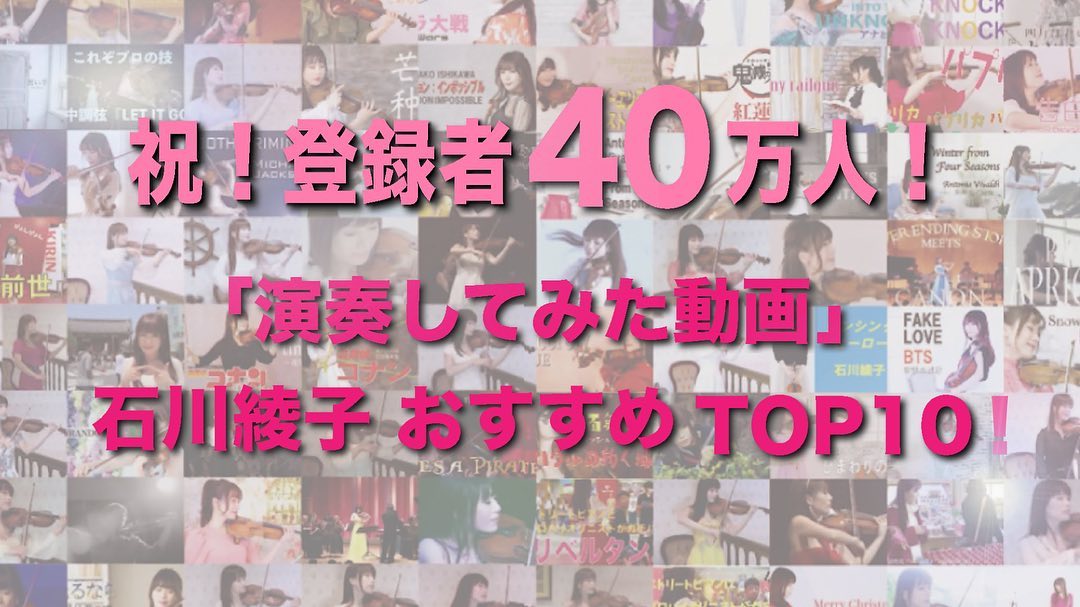 @石川綾子 @石川綾子: 祝YouTube40万人ありがとうございます! いつも温かい応援をありがとうございます 40万人を記念して、これまで投稿しました「演奏してみた動画」を振り返っ… 2021-08-12 祝YouTube40万人ありがとうございます!🎉 いつも温かい応援をありがとうございます☺️ 40万人を記念して、これまで投稿しました「演奏してみた動画」を振り返ってみました!お好きな動画はありましたか?🎻 ↓ #youtube #ayako_ishikawa#石川綾子Ayako IshikawaIshikawa AyakoYouTube WACOCA: People, Life, Style.