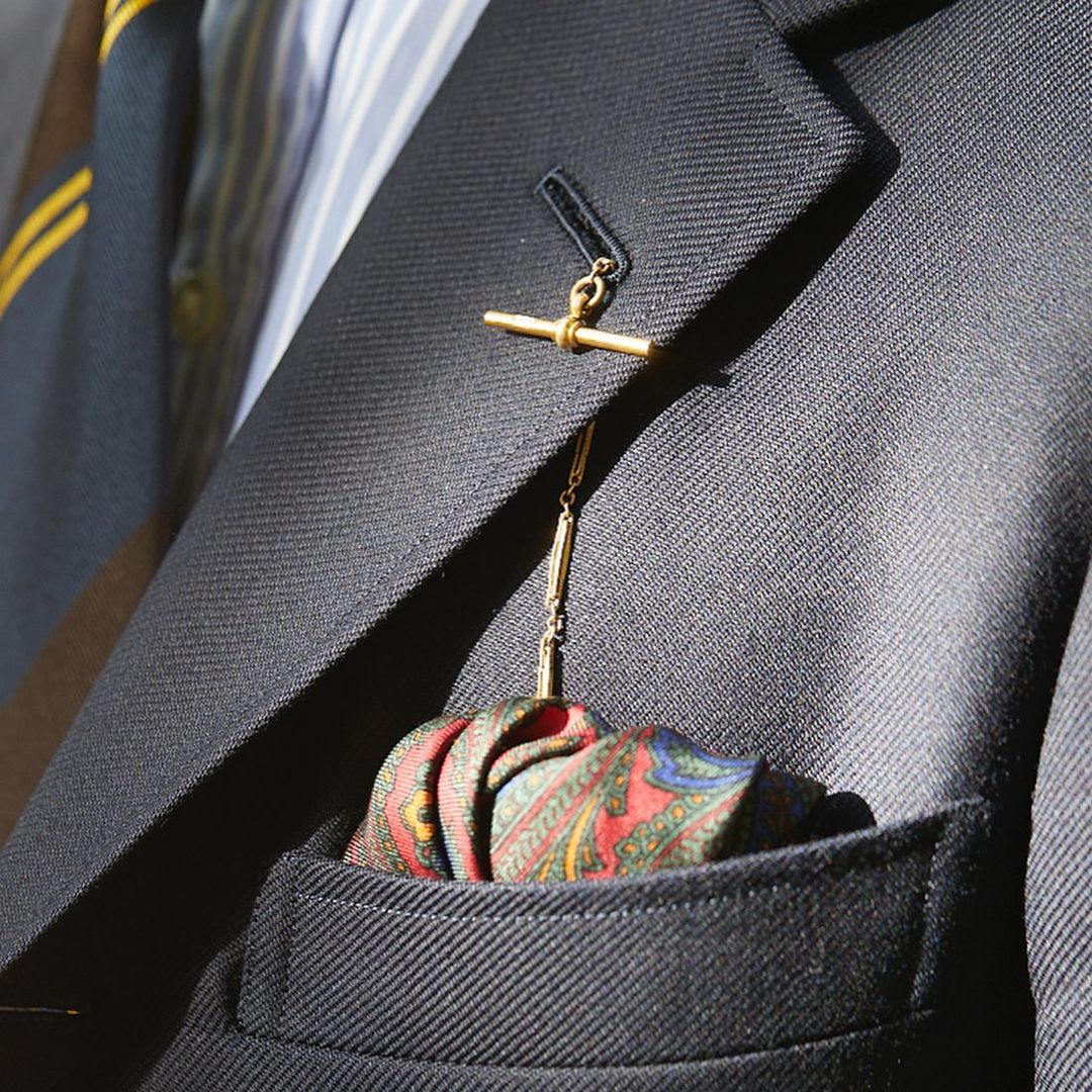 ラペルチェーンをアクセントに挿しました」