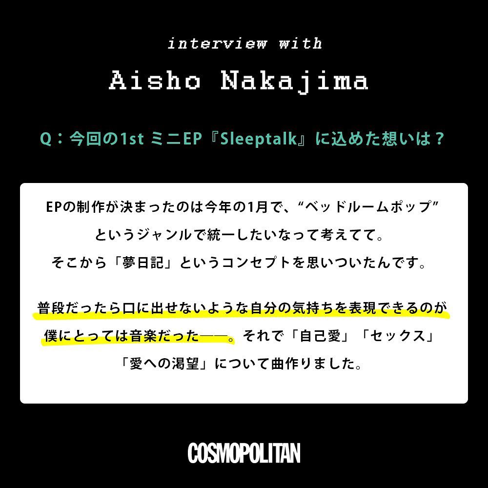 #aishonakajima #aisho #singersongwriter #singer #artist #interview #sleeptalk #cosmopolitan #cosmopolitanjapan #シンガーソングライター #アーティスト #インタビュー #コスモポリタン #コスモポリタンジャパン