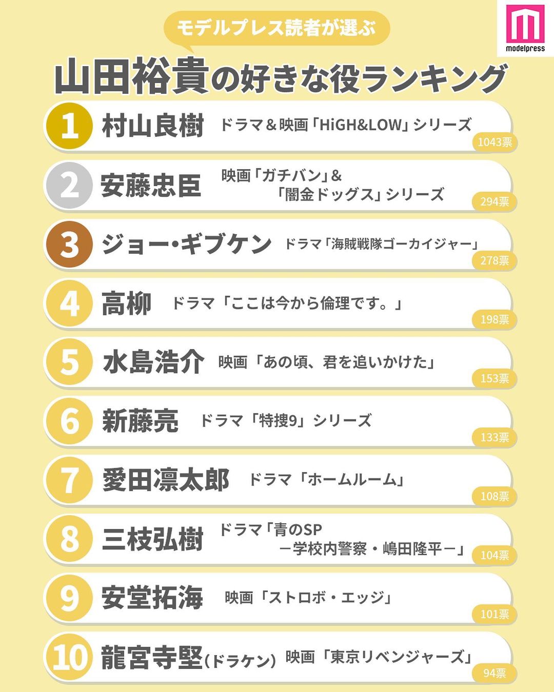 🚙 山田裕貴の好きな役ランキング