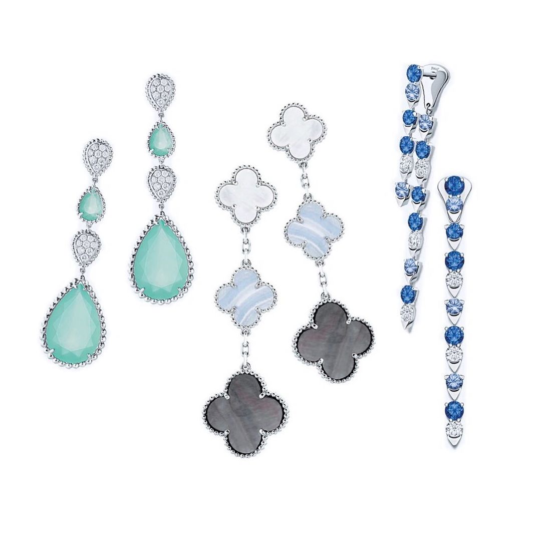 2色のサファイアとダイヤモンドをリズミカルにあしらって。耳を挟み込むようにつける長さの異なる2つのパーツは、自由自在にアレンジできる3ウエイ。