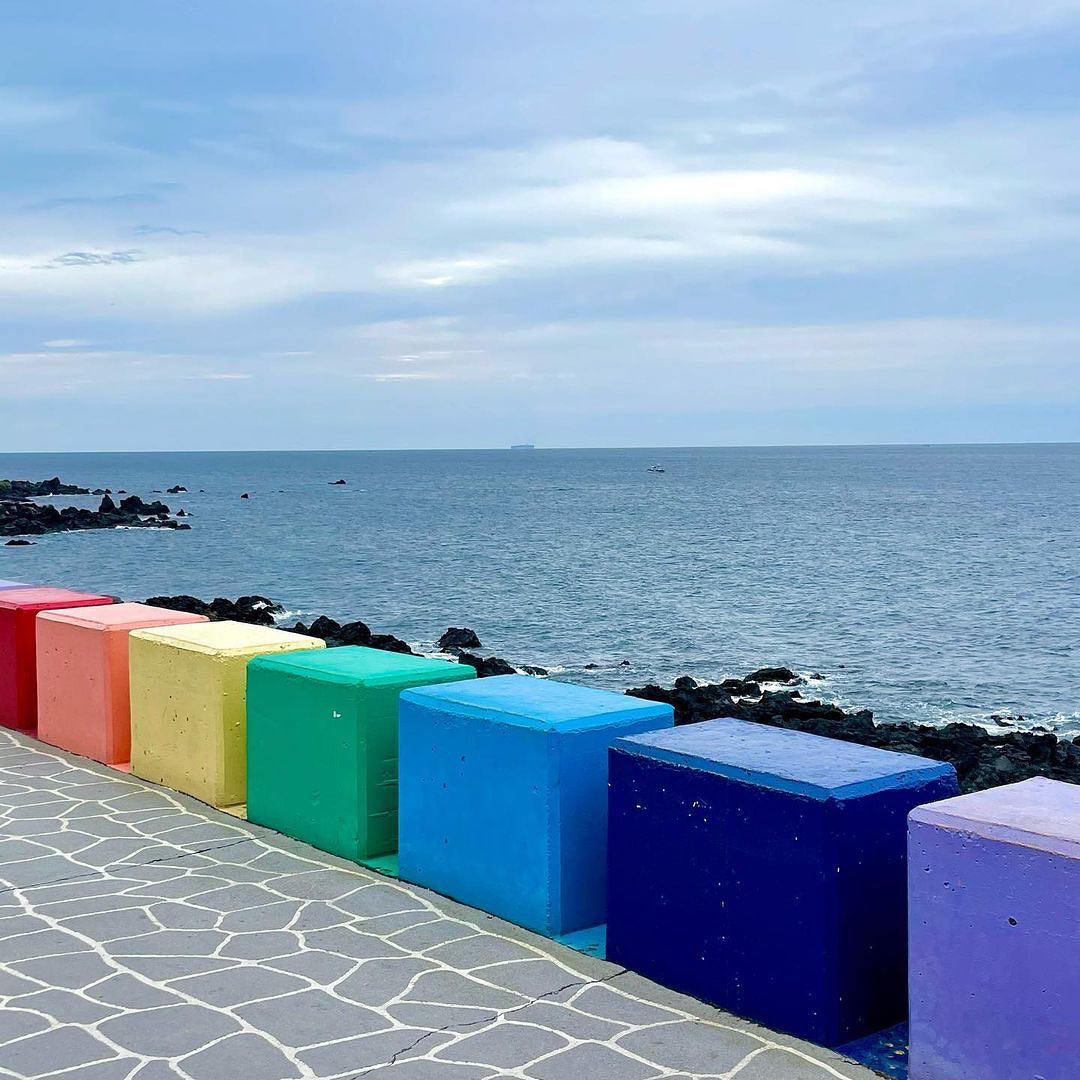 遠くまで続くカラフルな道と青い海がとてもきれいです🌈 チェジュ島に行ったら必ずここで写真を撮りたくなるようなインスタ映えスポットです!