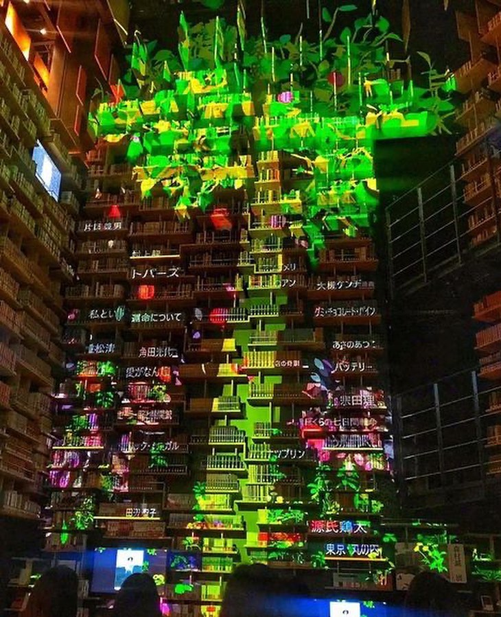中でも、高さ8mの本棚に約5万冊の書籍が並ぶ『本棚劇場』はフォトジェニック間違いなし!30分ごとに巨大本棚に投影されるプロジェクションマッピングも必見です👀