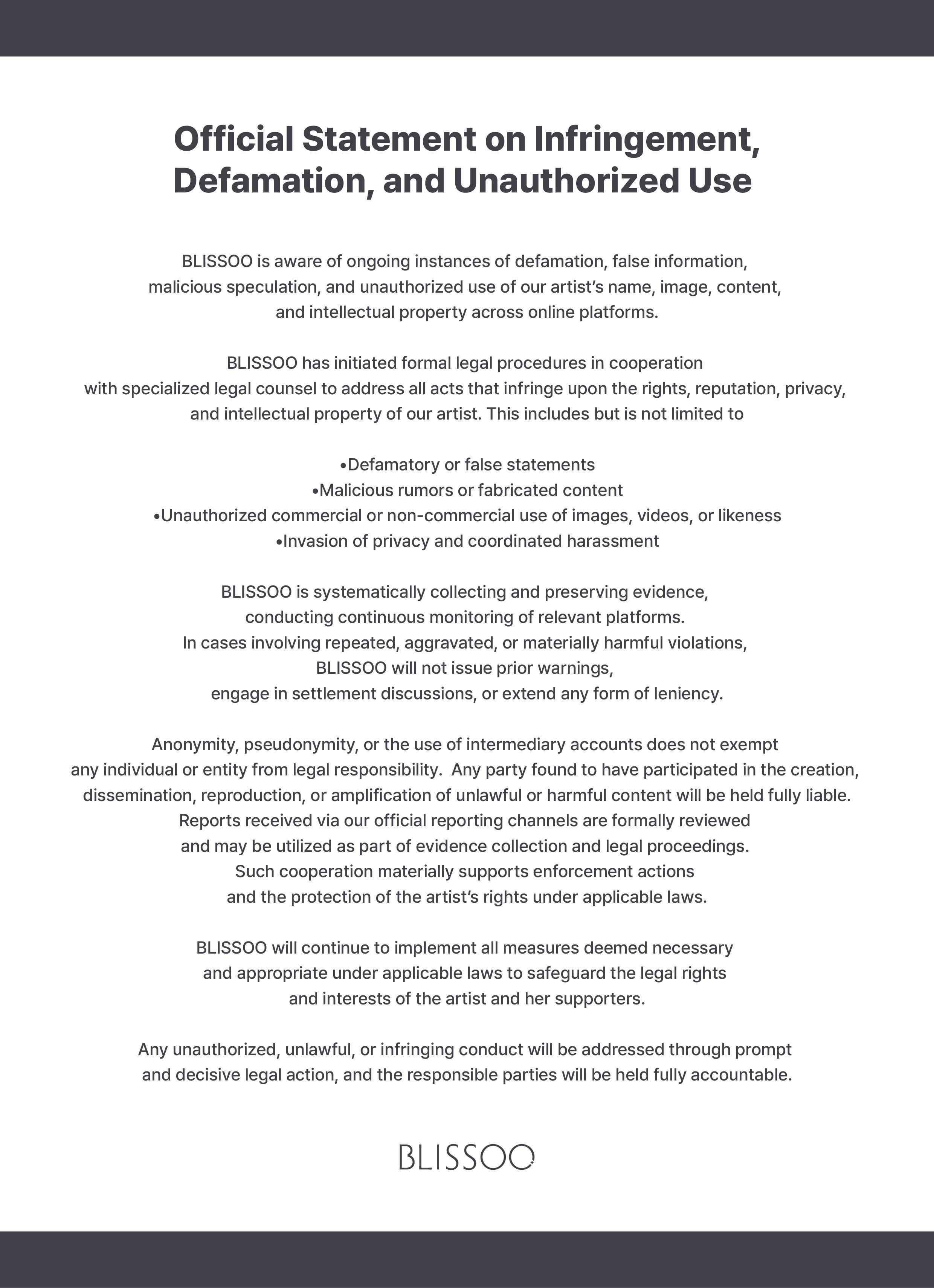 260119 BLISSOO | Official Statement on Infringement, Defamation, and Unauthorized Use