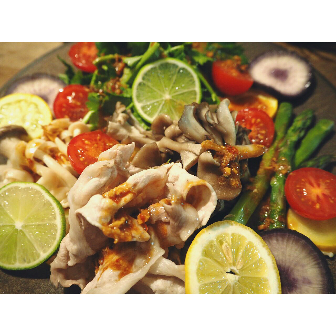 蒸したきのこと色々野菜と豚ロース、たっぷりパクチーとピリ辛ダレで。