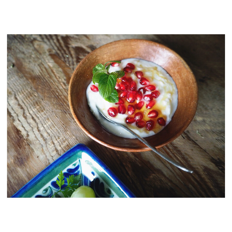 素焼きの器には、ヨーグルトとハチミツとザクロを。