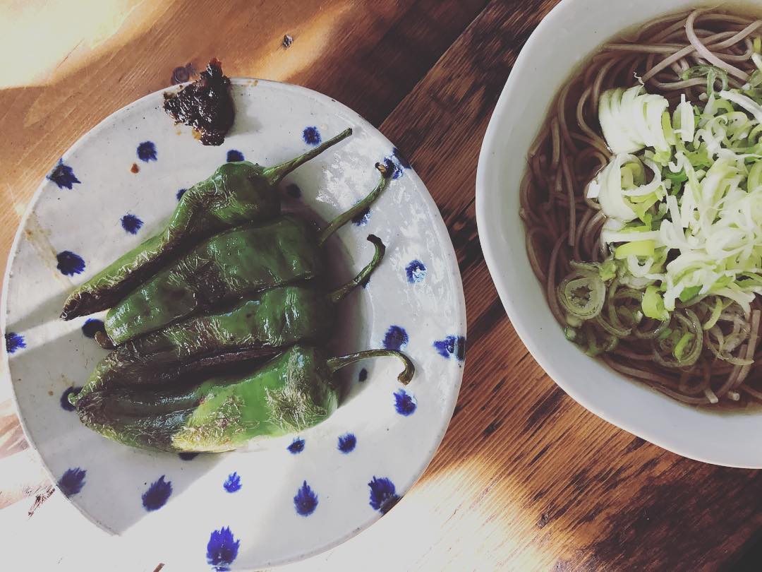 これから海外なので、冷蔵庫片付けようと、遅めの昼ごはんは無農薬万願寺とうがらしの胡麻油炒めと山形蕎麦。