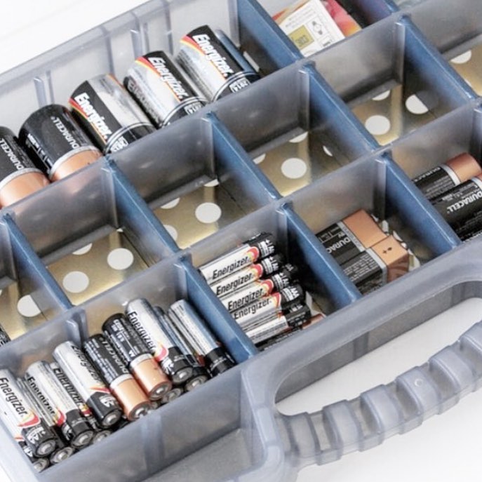 What a neat idea for battery storage! Gather all of the loose batteries around your house and place them in a small kit intended for nails and screws. You could also keep a mini screwdriver in there for future convenience. @hellocorral
