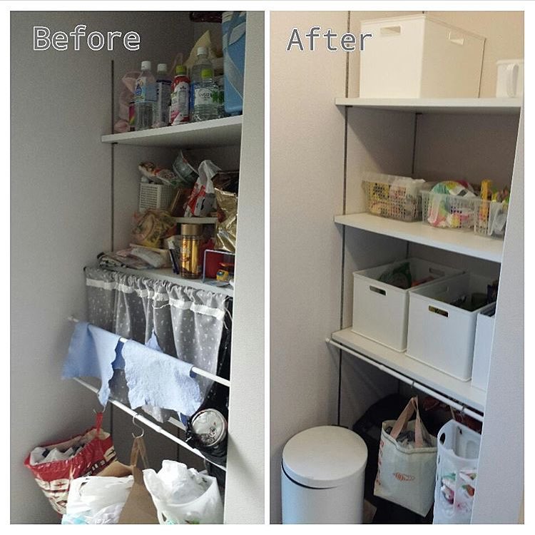 This is another example of what I mean by reserving storage solutions for after you’ve tidied. It is clear in the “after” that the containers are not hiding the kitchen items or being used as repositories for random food products. There is a calmness to the “after” that goes beyond the uniformity of the white bins. Via @masumi_yy