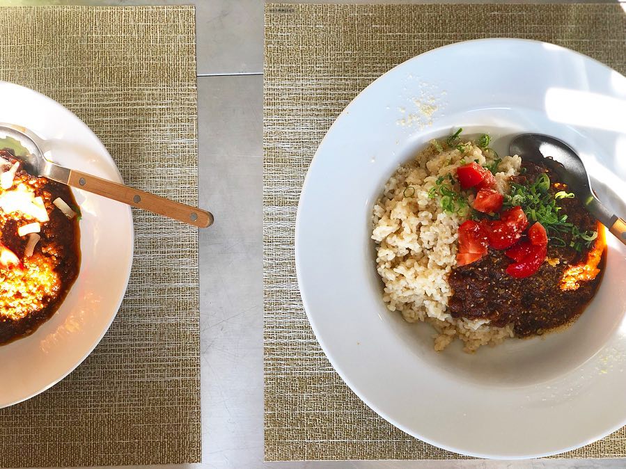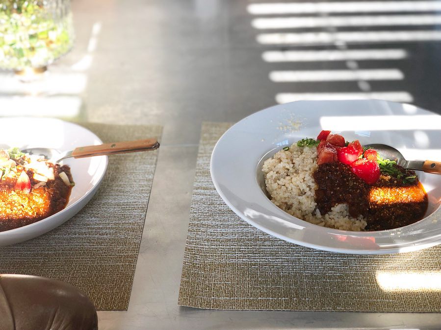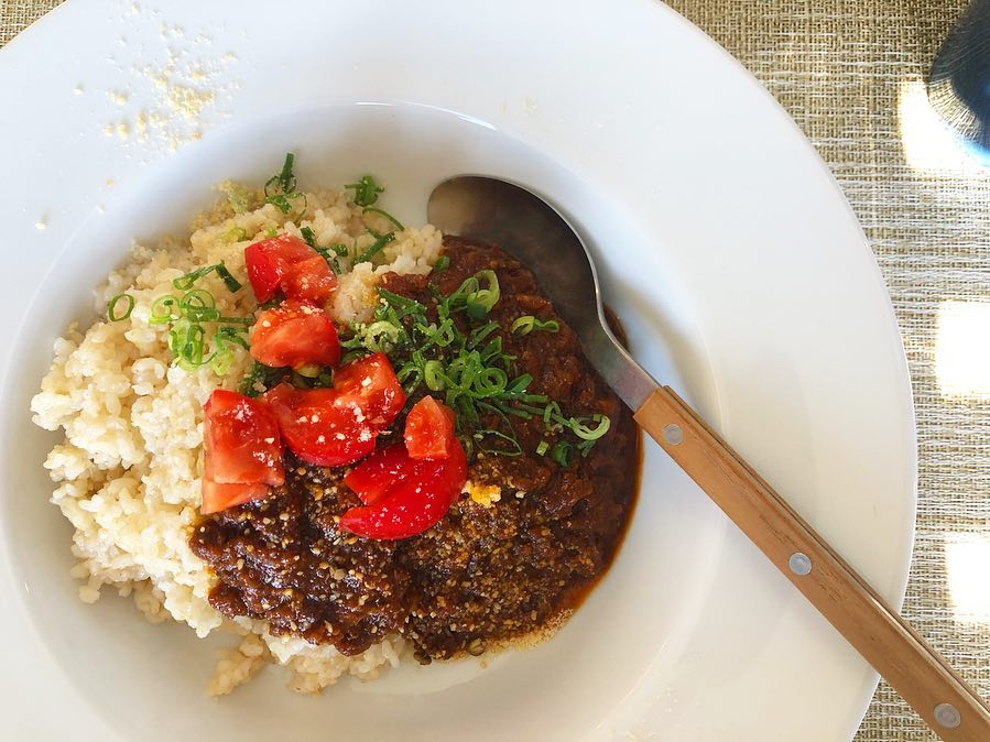 昼に炊き上がるようにしていた金芽玄米に冷凍保存してあったカレーをかけて。