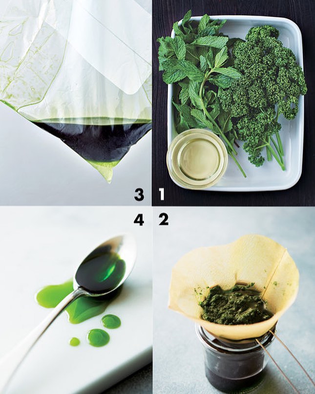 2️⃣コーヒーフィルターを大きなグラスなどにのせ、①の液を流し入れる。冷蔵庫に入れてひと晩漉すと、グラスにグリーンのオイルがたまる。