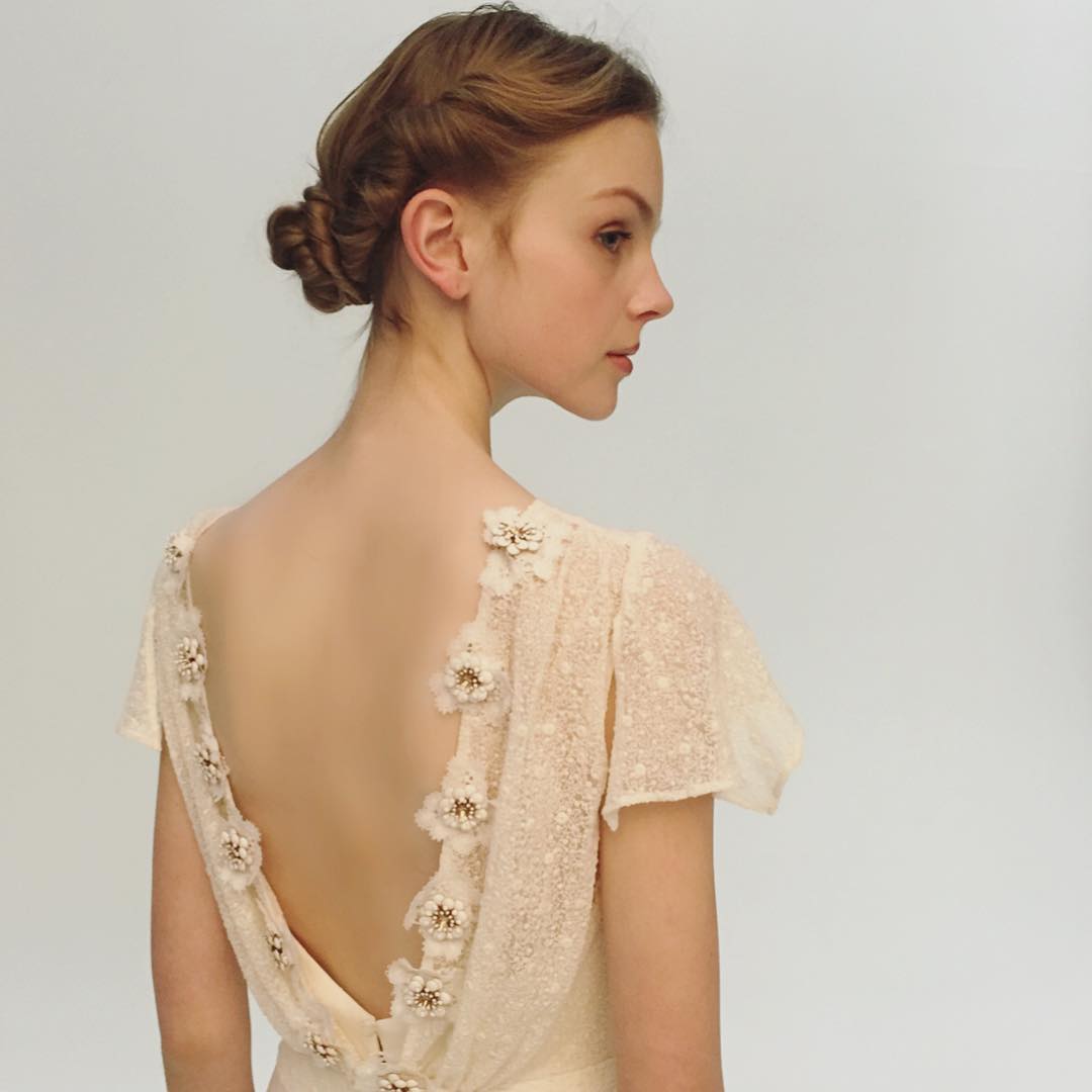 背中の花コサージュがとってもキュートなヴィンテージ風ドレスには、低め位置でゆるっとまとめたシニョンスタイルが好相性💕💕💕