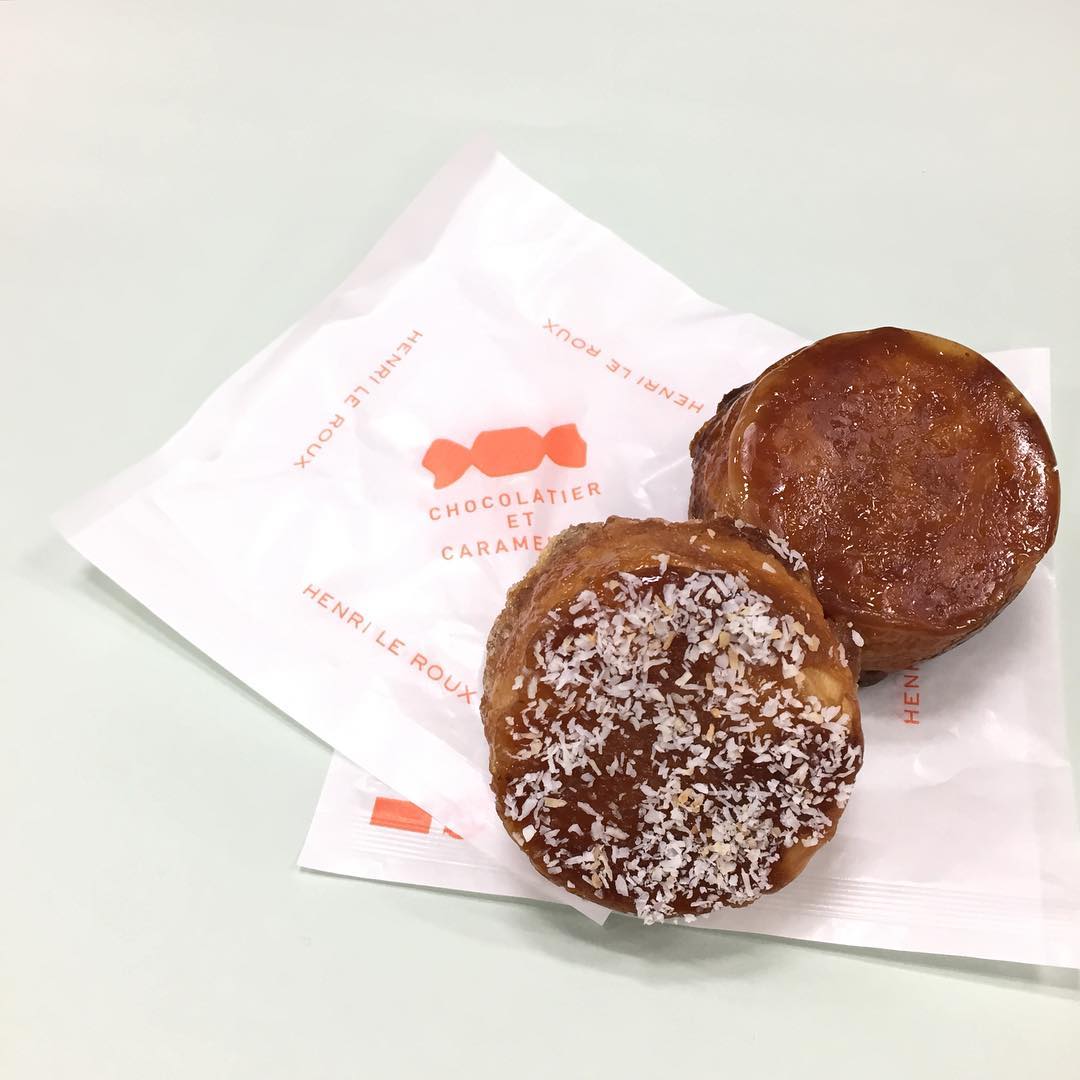 「HENRI LE ROUX (アンリ・ルルー)」の人気商品クイニー・アマン。今日は定番のC.B.S(塩バターキャラメル・写真奥)と、これからの季節にぴったりなピナコラーダ🍍(写真手前)をセレクト。ココナッツとパイナップルピューレの南国感たっぷりな組み合わせに、濃厚なキャラメルとラム酒の風味が大人っぽい🌴