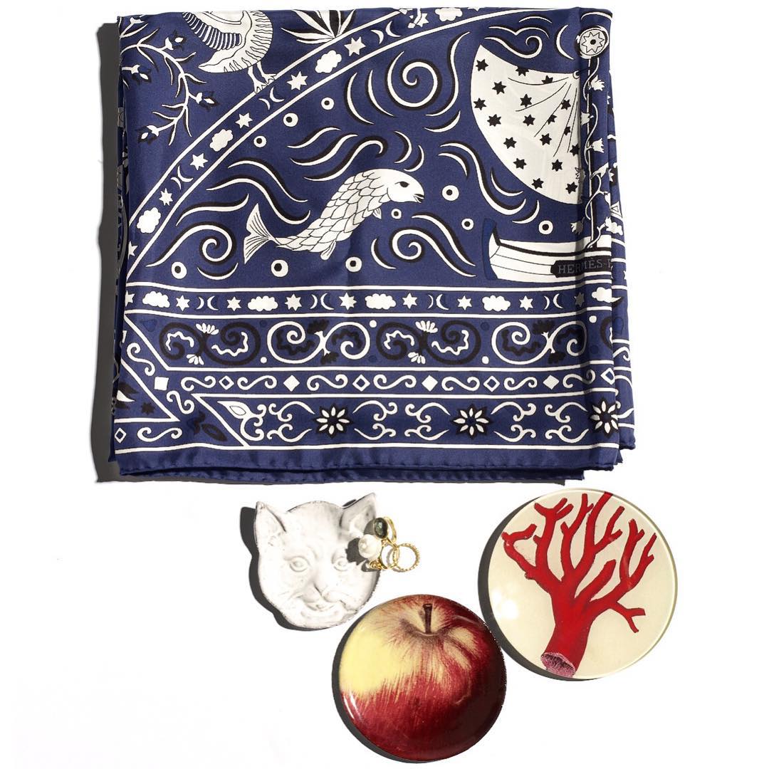 もはや指にないとソワソワしてしまう「マリーエレーヌ・ド・タイヤック」。目に入るたびにこの不思議な寄り添い方に感謝しちゃいます。白バラモチーフは40歳の誕生日に買った「ディオール」のもの。ブルーのバンダナは、ストリートなバンダナ×「エルメス」のシルクというのが最高! “風の民”というポエティックな名も、物語に引き込まれるような柄も大好き。和洋問わず小さいお皿をついつい集めてしまう私ですが、「ジョン・デリアン」と「アスティエ・ド・ヴィラット」は発想がフレッシュでいつもステキな驚きがあって大好きです。(副編集長 Maiko)