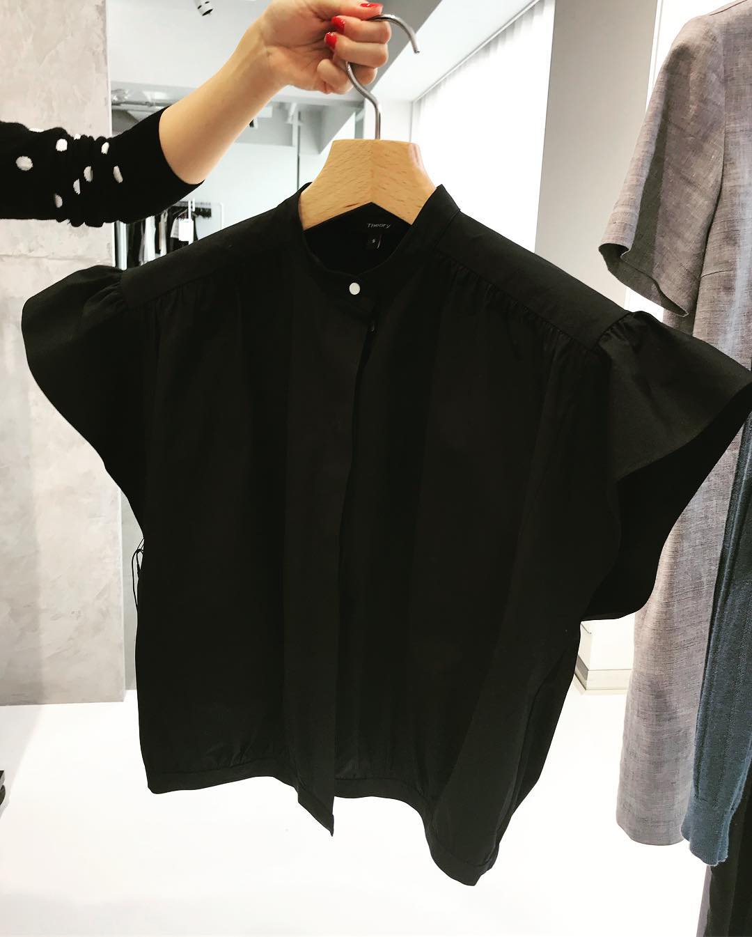 2枚目 フレアな袖が印象的なショート丈の黒ブラウス。デニムにさらっと合わせるだけでも素敵になるのが、容易に想像できます✨