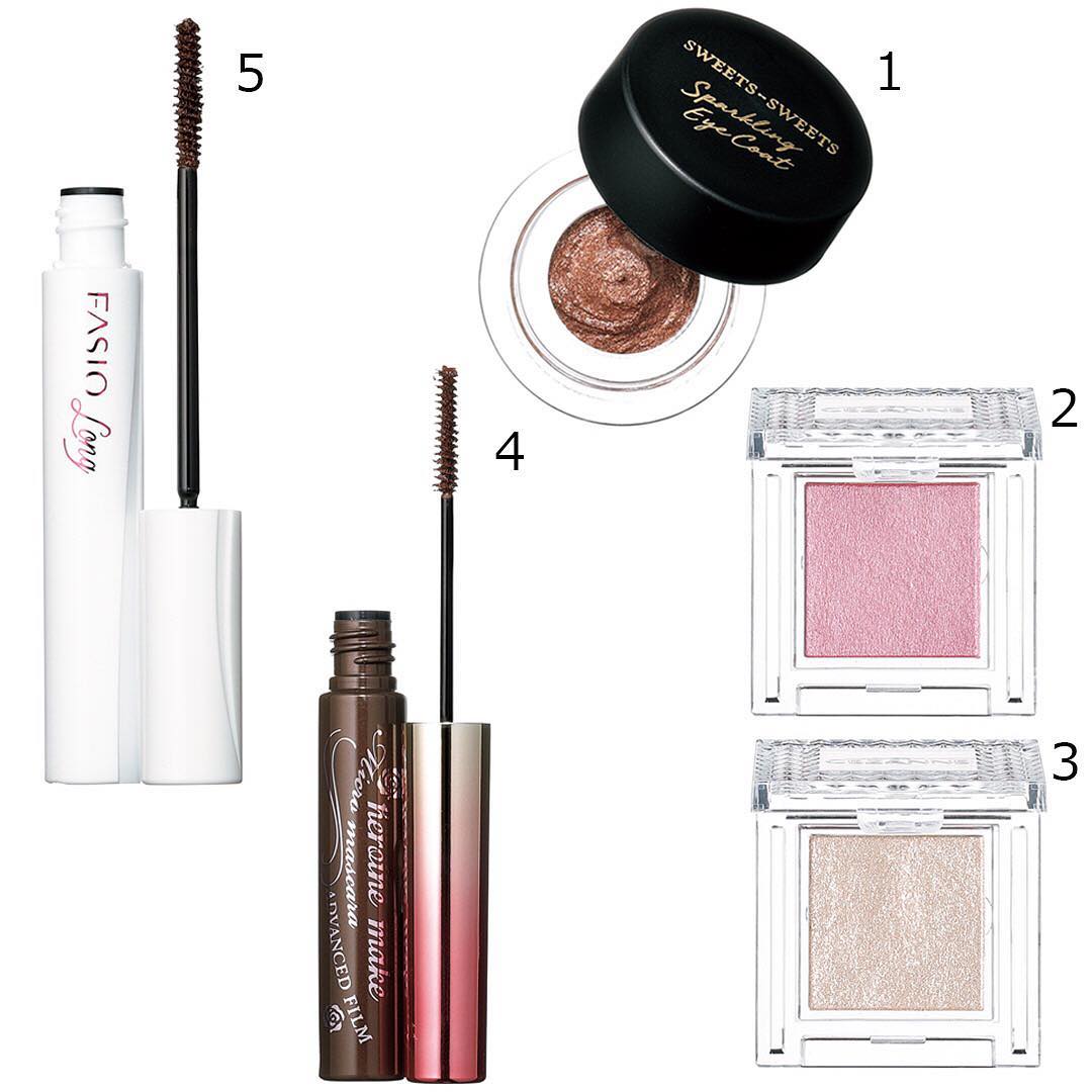 アイメイク:【1】1.スウィーツ スウィーツのアイシャドウを、アイホールと下まぶたの目尻に薄くのばした後、二重幅に2.セザンヌのくすみピンクシャドウをふんわり重ねて絶妙なピンクブラウンに。