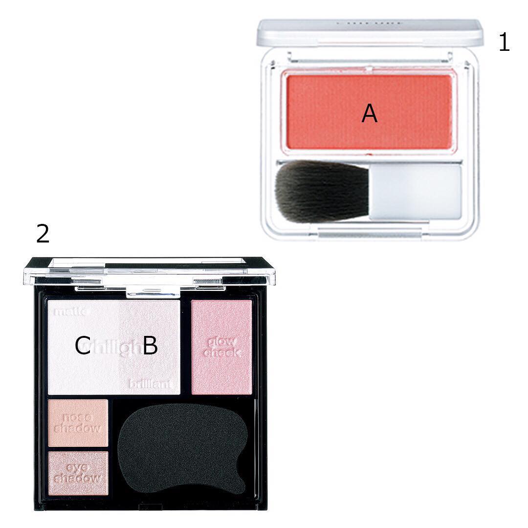 チーク:1.ちふれのチークAを斜め楕円形に入れた後、同じ範囲に2.ケイトのマルチカラーのマットなホワイトCをふんわり重ねて色味を抑え、パールホワイトBをチーク上端に入れて立体的に。(7枚目)