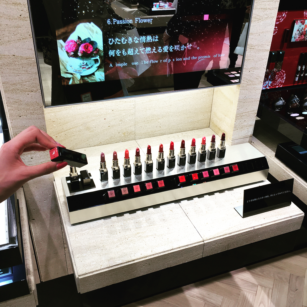 まず目を引くのは、中央にある大きなドレッシングテーブル。自分専用のドレッサーのように商品をじっくりお試しできます💋さらに、大きな鏡の前に並んだルージュを手に取ると、それぞれのイメージが鏡に映し出される「ラディアントミラー」は幻想的な雰囲気。お気に入りの1本を見つける手助けをしてくれます💄