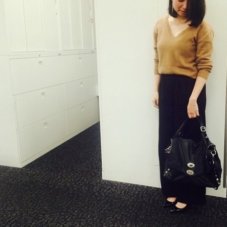 ボブにヘアチェンジした弊誌デザイナーSさん。トレンドのフルレングスのワイドパンツの着こなしも、髪の毛が短いとぐっとバランスが取りやすくなったと言っていました☆