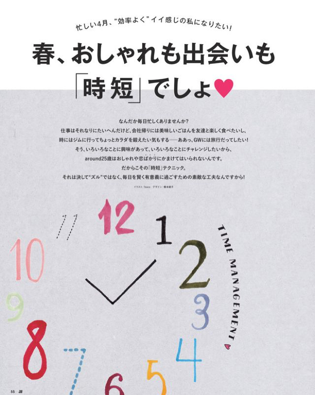 仕事に、趣味に、恋に…毎日忙しい25歳。新年度のはじまりはもっと忙しくなるはず。今月の大特集では、“効率よく”イイ感じの自分になれる、おしゃれの「時短」テクニックをお届けします!